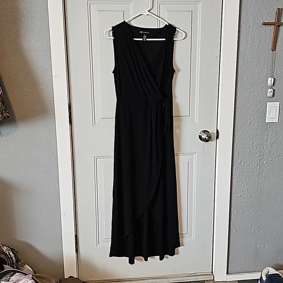 very cute dress. little side tie to snatch your waste. black size medium. higher cut in the bottom front. very stretchy. very flowy