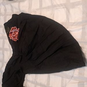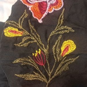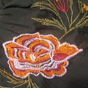 Black off the shoulder dress with beautiful detailed colorful flower sleeves.
