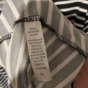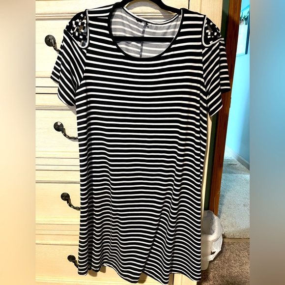 Black and white striped dress. It has an open design on top of shoulders that makes it very pretty. It is very soft and comfortable. The size is 1X. Tag from the dress was removed.