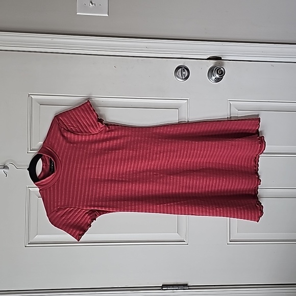 Stretchy spring dress. I would call it a dark reddish pink. A "solid pink"