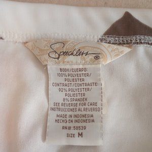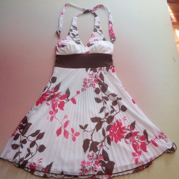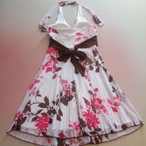 Flowy white dress with pink and brown flowers, in a medium.