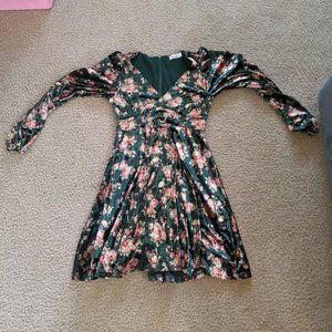 Crushed velvet green with flowers dress. Mid length. Zipper closure in back. Is not a maternity dress but I was able to use it as one. Sized medium. Worn once.