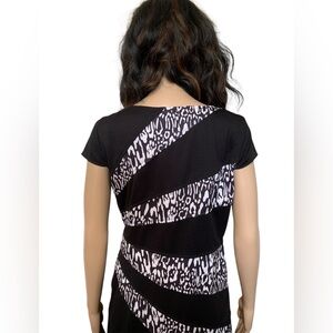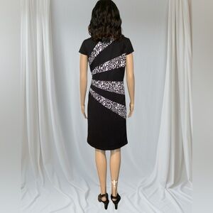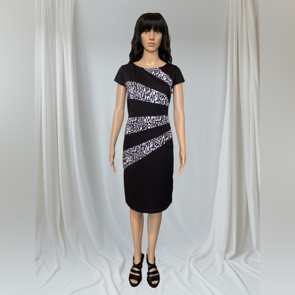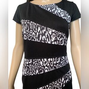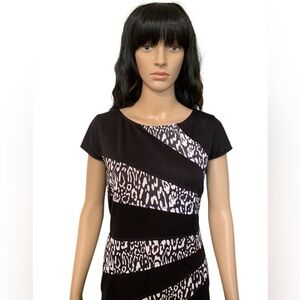 Ladies black/white cheetah print sheath dress fully lined with cap sleeves and side zipper. A little stretchy for that just right comfort, class and fit.