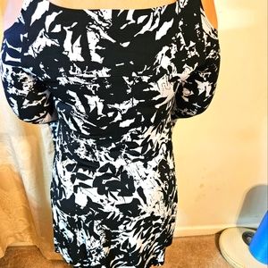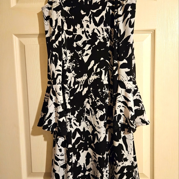 Karen Kane Sexy Summer Dress. Black and White dress with long sleeve, flare at wrist with skinny ateioes with cold shoulder.