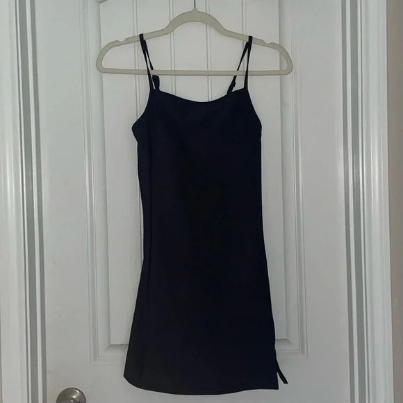 Cute and sporty athletic dress. Is spaghetti strapped and has an adjustable straps. At the bottom on the right side it has a little slit at the end of it. Also has a built in bra so no need to wear one! It’s very form fitting.