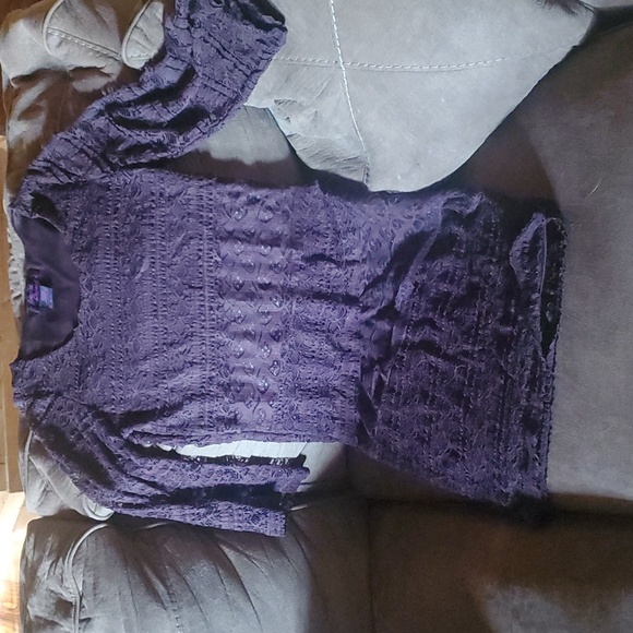 Cute dress with layered lace detail. Item does not have size on it. Fits like a small.