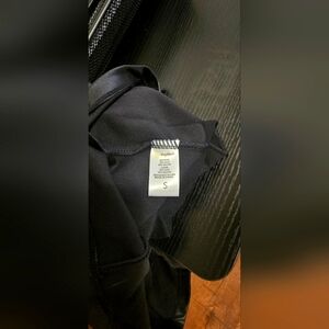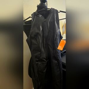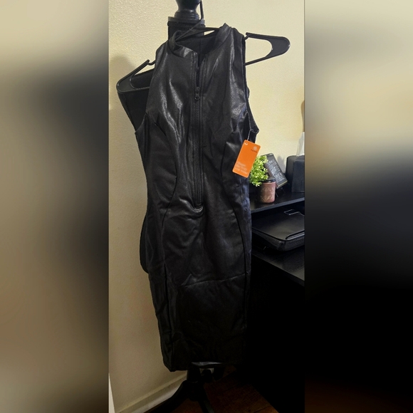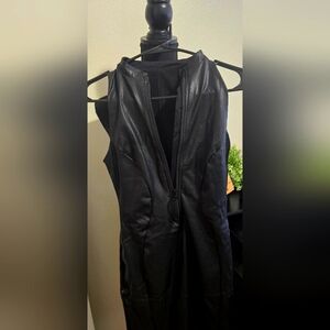 Black Fo leather dress with built in shape wear with front zipper razor back style.
