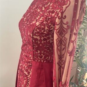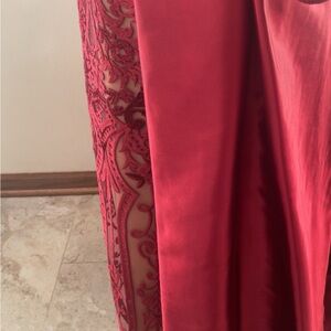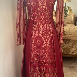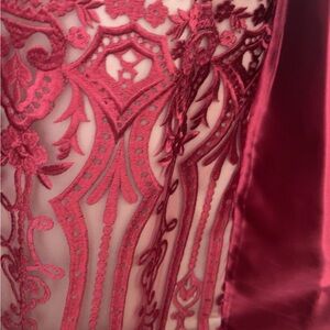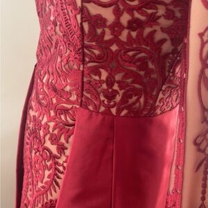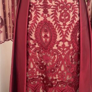 Embroidered lace dress beige fabric underneath attached to the lace has a satin in the back as a attached skirt