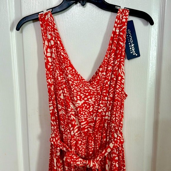 Anna-Kaci summer dress, orange and white, with elastic waist, tie belt.l, and pockets. Very soft, flowy fabric. New with tags.
