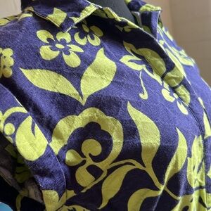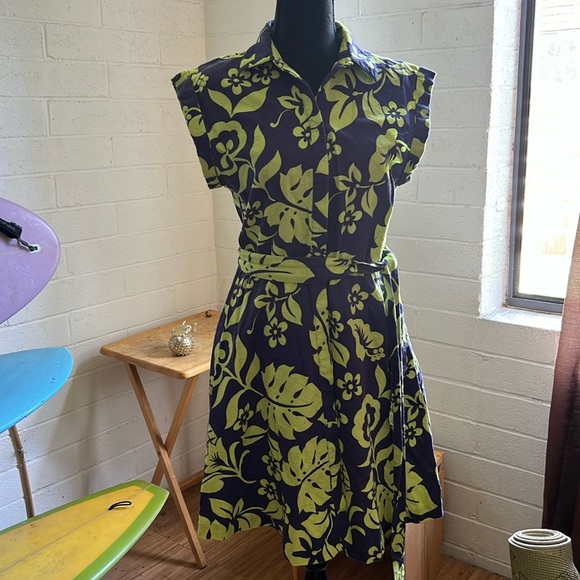 100% Cotton collared dress with short sleeves, Pineapple novelty print of green and blue. Comes with the cloth belt
