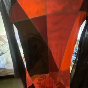 Form-fitting dress for evening. Sheer sleeves. Black/deep purple/orange. Sheer long sleeves. Long length.