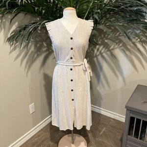 Sleeveless dress with tie around band, and bonus: pockets! Size Medium. Never been worn, brand new.