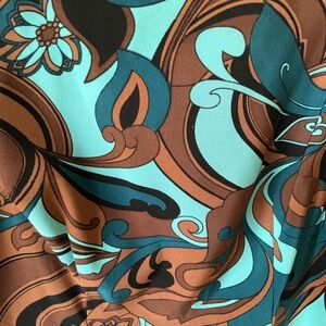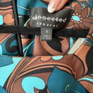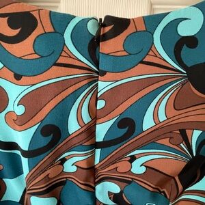 The colors on this dress are so pretty - whether you are dressing for work with a nice blazer or going out on a summer evening. The material on this dress just feels good. It is formfitting with that little bit of give that feels great on! Super clean no rips or tears from clean non-smoking home.