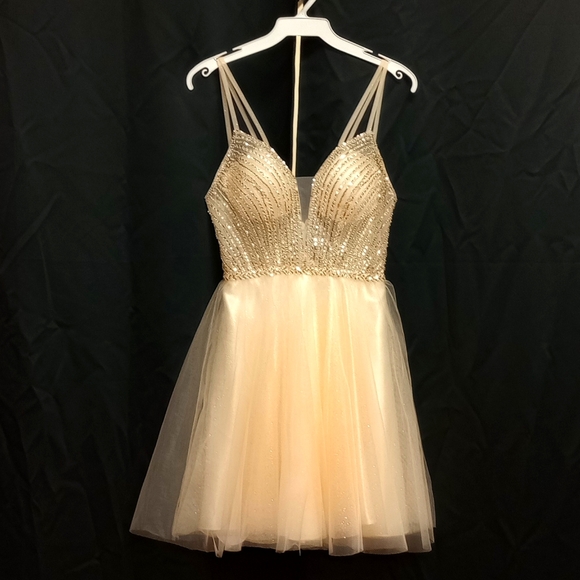This beautiful light yellow shimmer tulle & satin dress is perfect for any special occasion. (Junior)