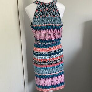 Statement pattern dress with vibrant color. Length 21” from elastic waist and belt. Excellent condition.