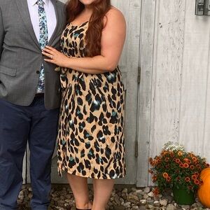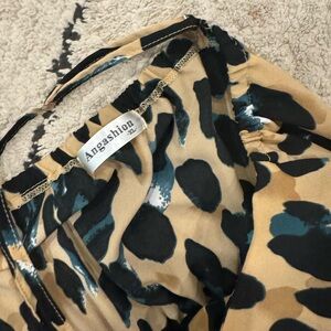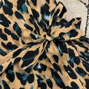 Leopard print dress with blue features. Wrap style with bow tie around the waist