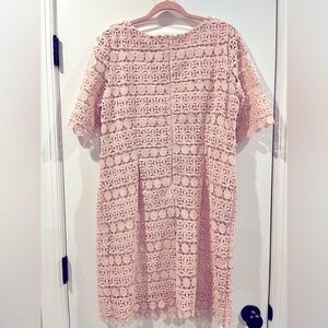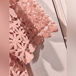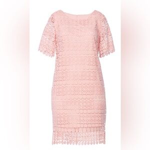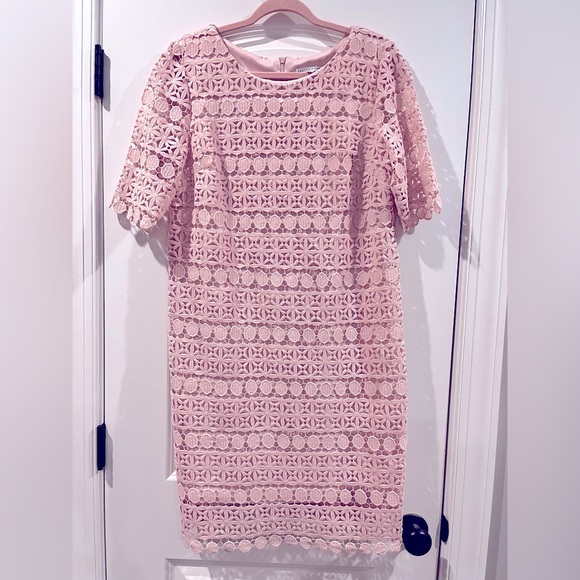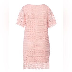 Sandra Darren (NWOT) lace, lined, appliquéd, shift dress. This dress is 37 inches shoulder hemline and 20 inches armpit to armpit. It would make a beautiful dress for an engagement party or bridal and baby showers. I bought it and never wore it. It is peach in color. That wasn’t a choice.