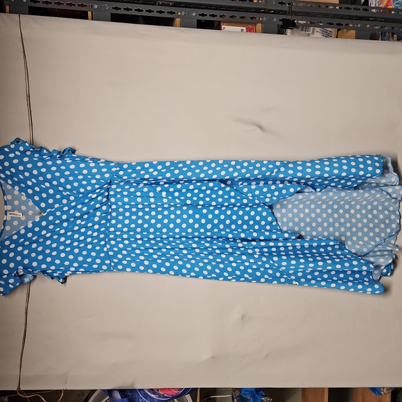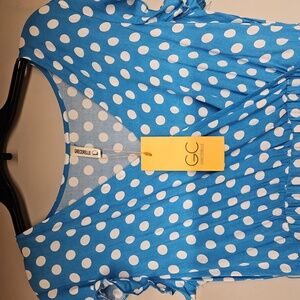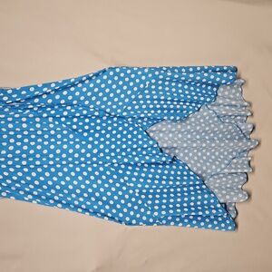 Beautiful long, light summer dress, blue with white polkadot. Ruffled short cape sleeves, Ruffled bottom.. New with tags. Brand Grecerelle