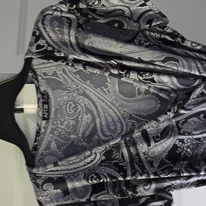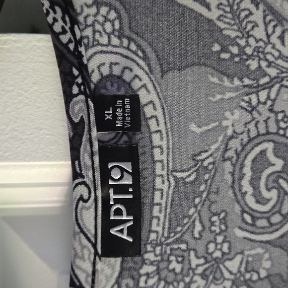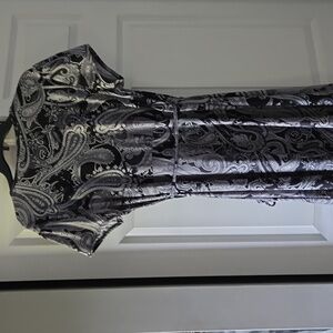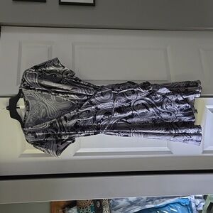 this xl dress is a wrap around with ruffles on the hem. it is short sleeved and knee length. it has no pockets. it is made with 96% polyester and 4% spandex. it is super comfortable and looks great
