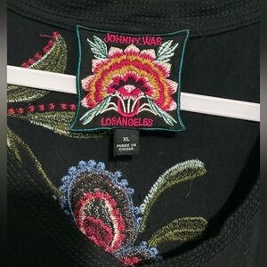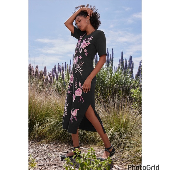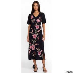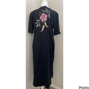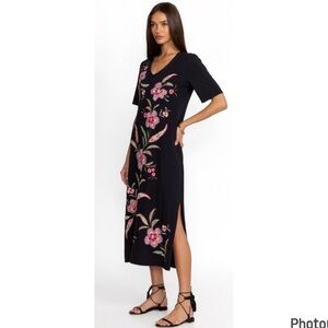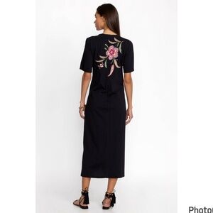 Like new, worn once Johnny Was Libbi Trapunto T-Shirt Dress! Cute black v neck dress with flowers embroidered all over the front and back. Has a side slit too, size XL. * Laying flat it is approximately 45 inches from shoulder to hem, or 50 from shoulder to the bottom of the dress and approximately 16 inches from armpit to armpit*
