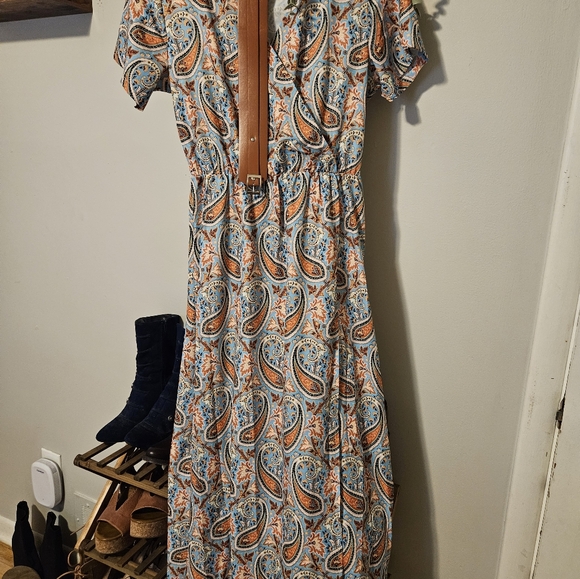 blue back ground with brown and tan. size small. come with a belt not the best belt though