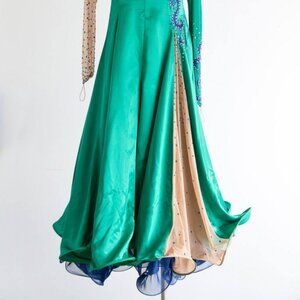 American Smooth Ballroom Emerald Green Satin Dress, Size Medium. Royal blue accents and underskirt. Lined, sewn in cups, back zipper. In very good condition, possibly a few stones missing.