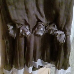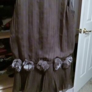 this is a sheer elastic waist dress with a dark brown built in slip underneath. has beautiful rosettes at waist. brown and grayish color
