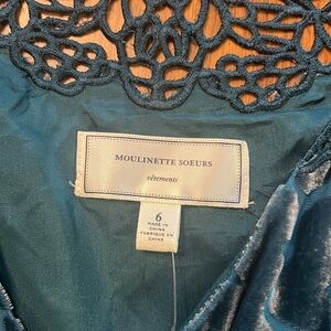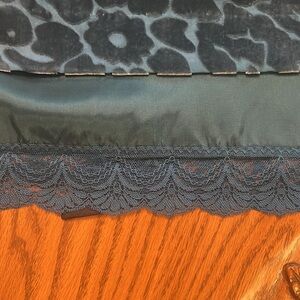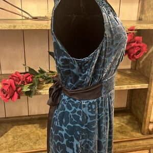 Beautiful silk and velvet and lace dress with black satin tie in back side zipper.L 38” shoulder to shoulder 13 inches arm opening 9 1/2” armpit to armpit 18” very flattering dress on from High end boutique