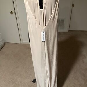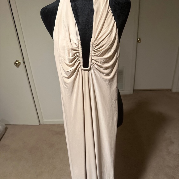 HOURGLASS PLUNGE MAXI DRESS - LIGHT NUDE . This dress will hug you in all the right places. The dress is new , but there is a little stain in the front.