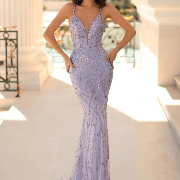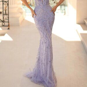Gorgeous lilac gown with a plunging mesh V-neckline and fully beaded shoulder straps forming cross straps design on the back. With a fitted bodice, the natural waistline features a beaded belt. It is a full-length dress embellished with shimmer appliques and paillette sequins.