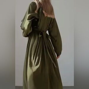 Oymimi Casual Green O-Neck Women's Dresses Elegant Long Sleeve Pleated Lace-Up Dresse