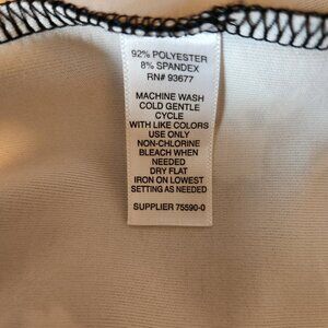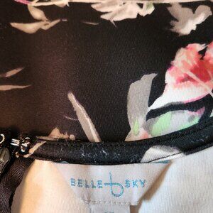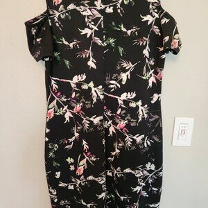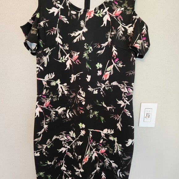 Black floral dress, worn twice, 37". Like New. Floral pattern consists of the following colors white, pink, grey and green. Sleeves are hard to see, but they are open in the shoulder area
