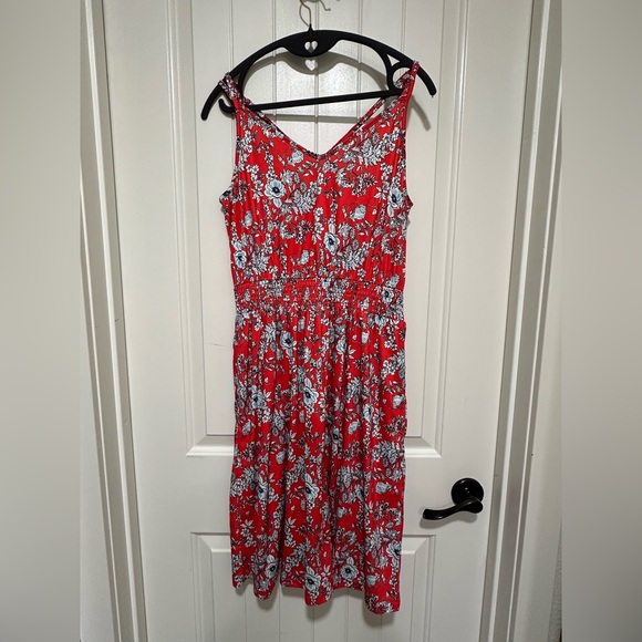 never worn dress with double spagh straps, elastic waist, medium length. Main color is red with white and blue flowers