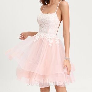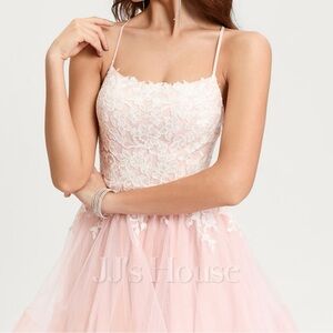 Pink ruffle chiffon dress with strappy ties in the back. Perfect for prom or homecoming! Bust 32.5”, waist 25.5”.