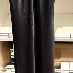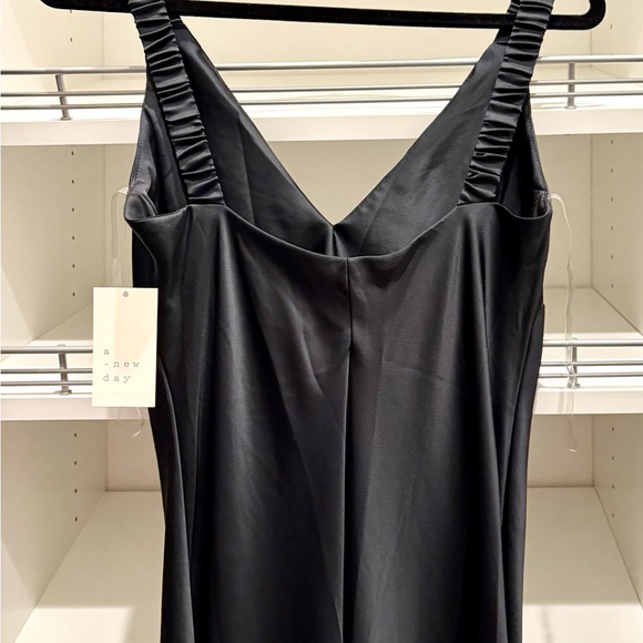 Black satin feeling long dress. Ruffle strap. Tags still on dress slit in back