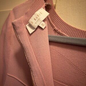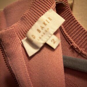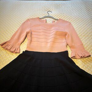 Party dress, fitted top part and flared bottom skirt. Knit and stretchy. Ruffled 3/4 sleeves. Back zipper. Just below the knee ( I am 5.4) 52% viscose, 45% polyamide, 3% elastane. Black bottom and top is more like mauve pink, ash pink