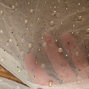 2 dresses both size medium, only worn once. Dusty blue dress underneath and sheer faux peral & rhinestone dress on top.