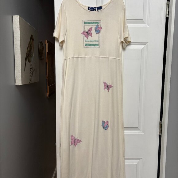 Cream tee shirt fabric dress with delicate butterfly inprints on the front
