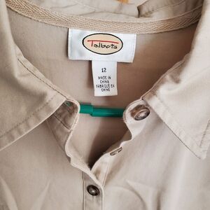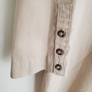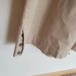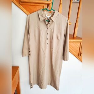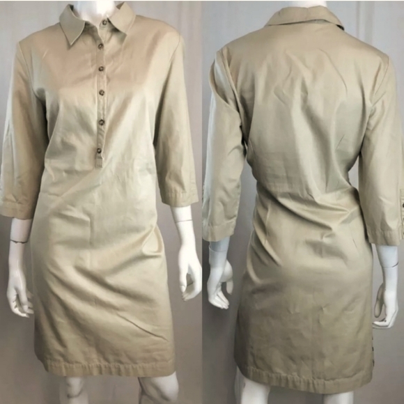 Classic khaki collared dress with buttons on front, at sleeves and at bottom for cute details. Such a great staple for your closet. EUC. Size 12. Mannequin image shown for style/fit only, not actual. pit to pit 21"