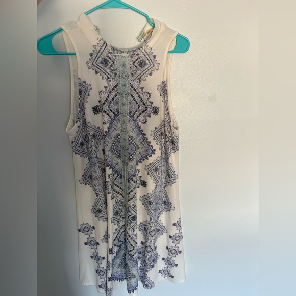 Stylish sleeveless dress with intricate blue patterns on a white background. Perfect for casual outings.
