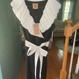 Black with white Nue by Shani dress. Never worn new with tags . Has stretch to it back zipper . White satin ribbon around waist.