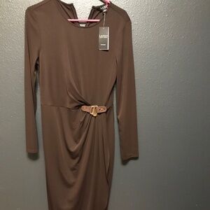 Buckle-Trim Stretch Jersey brown dress, long sleeve is defined by faux-leather buckled tab at the waist, a wrap style skirt and slim fitting silhouette