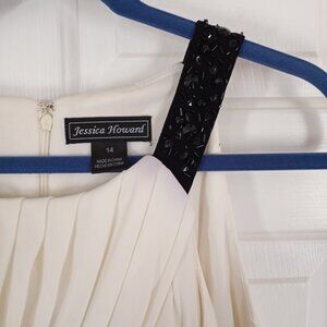 42" length, pleated detail in the top is also along the waist. solid black flared skirt.
