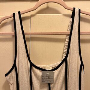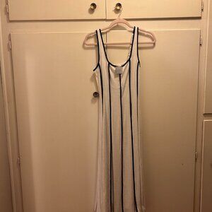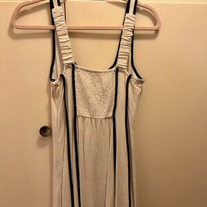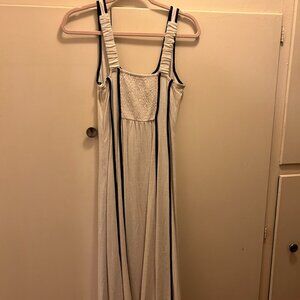 The color is off white, more like light cream. Linen dress with nice stretch feel. Full length, flowy bottom. 70% rayon, 30% linen.
