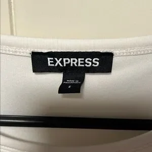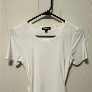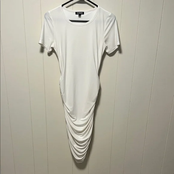 Chic white midi tight fitting short sleeve dress with ruched detailing. Perfect for versatile styling. Express brand size small. Worn one night for rehearsal.
