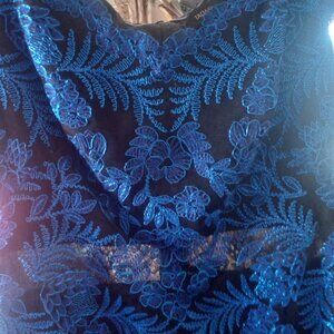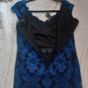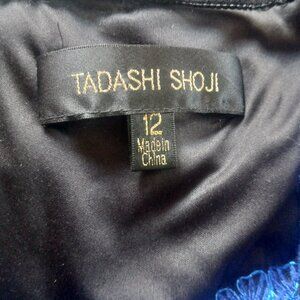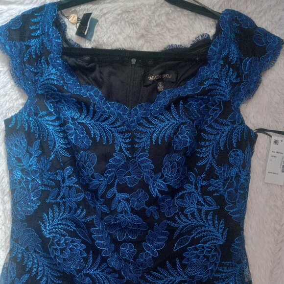 Brand new with its tags. Beautiful blue/ black lines dress with sheer insert at waist and hem. The lining hangs below the dress as pictured. True to size. Does have zipper in back that is not visable when zipped. Dress does have a slight stretch to it. Would describe as knee length. The blue is slight metallic shine. Tag states MSRP $388. By TADASI SHOJI A beautiful holiday party dress!!Unbelievably beautiful