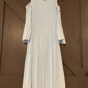 Beautiful lattice cut out neckline and matching open shoulder with flared sleeves, and fitted pleated bodice