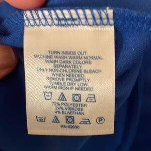 Beautiful royal blue color. Versatile knit dress with three-quarter length sleeves V-neck, faux wrap, self tie belt. Travels well and packs well with no wrinkles. Great for so many occasions. Very comfortable dress.