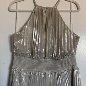 100% polyester, weightless, pleated flowy dress, adjust to the body really well and hides the belly for a comfortable date night or any special occasion.