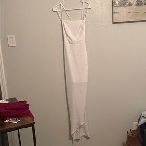 White with small black polka dots crisscross back in ,side slit,rusched by waist to slit.